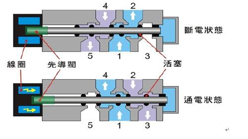 如图,表示3/2(三路二位)直动式电磁阀(常断型)结构的简单剖面图及工作原理。线圈通电时,静铁芯产生电磁力,阀芯受到电磁力作用向上移动,密封垫抬起,使1、2接通,2、3断开,阀处于进气状态,可以控制气缸动作。当断电时,阀芯靠弹簧力的作用恢复原状,即1、2断,2、3如图,表示5/2(五路二位)直动式电磁阀(常断型)结构的简单剖面图及工作原理。起始状态,1,2进气﹔4,5排气﹔线圈通电时,静铁芯产生电磁力,使先导阀动作,压缩空气通过气路进入阀先导活塞使活塞启动,在活塞中间,密封圆面打开通道,1,4进气,2,3排气﹔当断电时,先导阀在弹簧作用下复位,恢复到原来的状态。